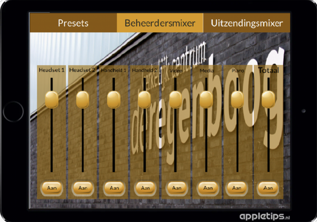 De iPad bediening is volledig op maat voor de beheerders gemaakt met relatief eenvoudige standaard tools. De schermen zijn uitgevoerd in de huisstijl van KC de Regenboog. Op verzoek van de beheerders is via een preset te selecteren welk deel van de zaal gebruikt wordt. Daarna kan in een ander scherm iedere microfoon aan en uitgezet worden en het volume daarvan geregeld.